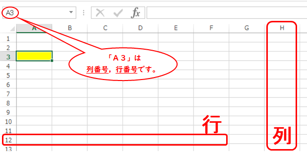 ですから、横方向のまとまりに付いた数字は「行番号」、縦方向のまとまりに付いたアルファベットは「列番号」になります。