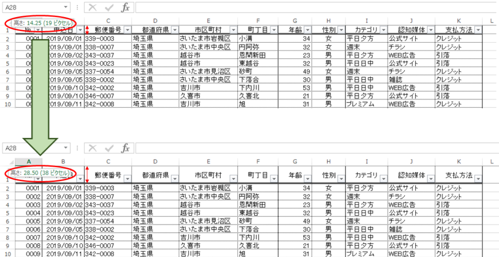 見出し部分の「行高」を2倍くらい高くする。