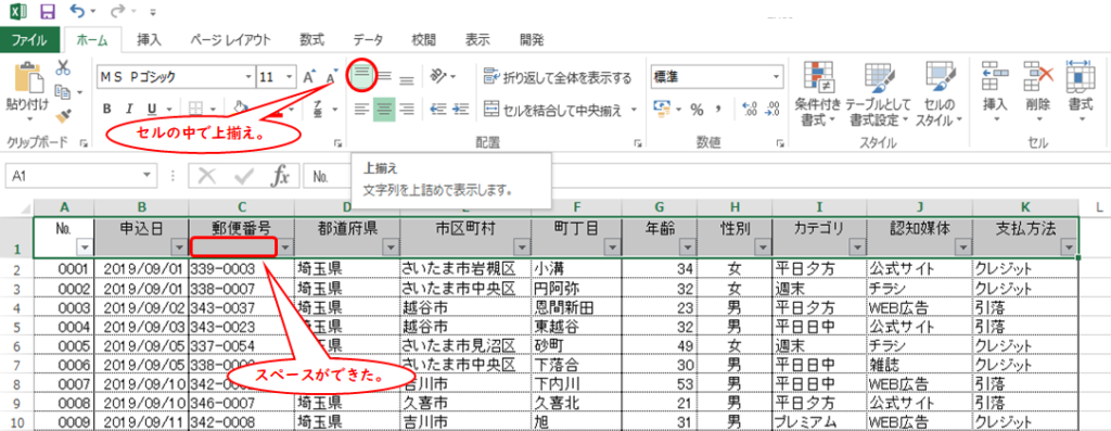 ②見出しの文字を上揃えにする