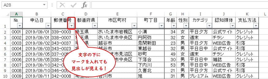 例えばこの表。フィルターのマークでセルが横に広がっています。