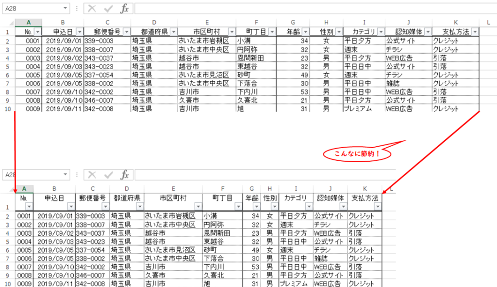 項目が少ない表なら良いですが、項目が多いと横にスクロールしなければ表全体が見えず、使いづらくなってしまいます。