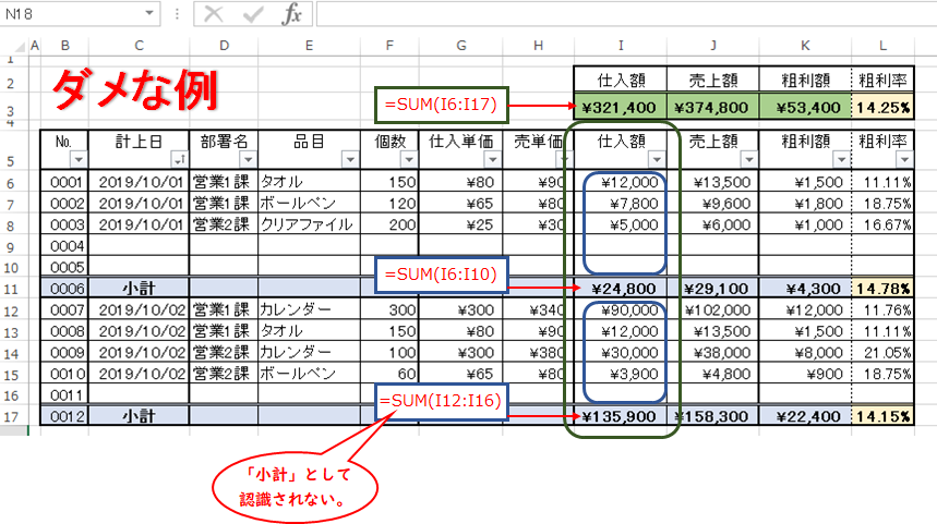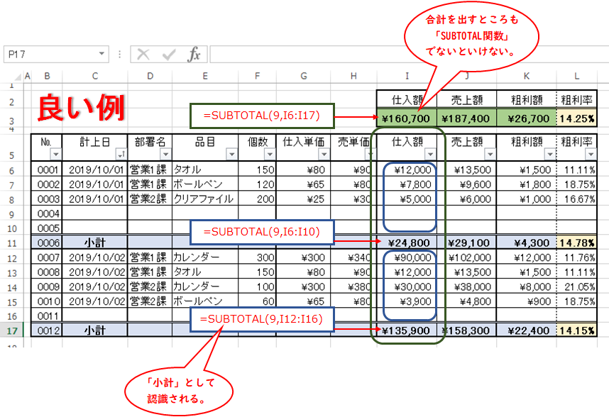 小計も合計もSUBTOTAL関数にすると、小計として認識されて、合計が2倍になりません。