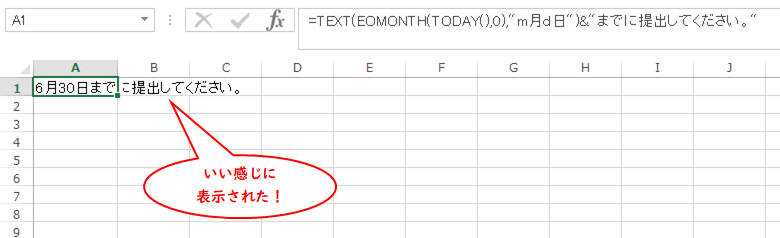 =TEXT(EOMONTH(TODAY(),0),”m月d日”)&“までに提出してください。”