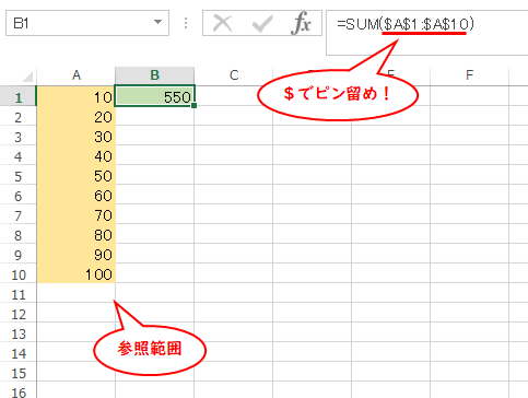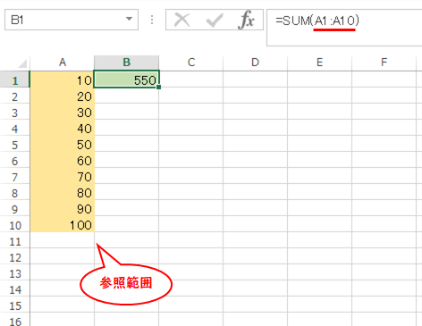 緑色のB1セルにSUM関数を書いて、黄色のA1からA10までを足してみます。