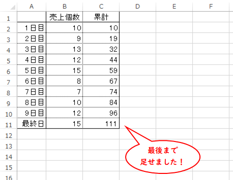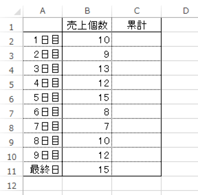 まずこの表。B列にその日の売上個数、C列にそれまでの累計を出すとします。