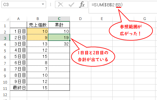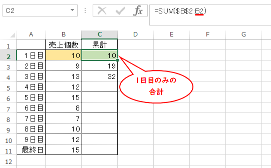 C2セルには1日目の累計の「10」、C3セルには1日目と2日目の累計の「19」、C4セルには1~3日目の累計の「32」といった具合です。